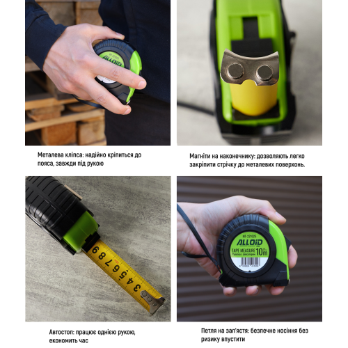 Рулетка Alloid Base — це компактний і надійний інструмент, який ідеально підходить для щоденного використання в побуті, при монтажі, оздоблювальних чи будівельних роботах. Завдяки надійному механічному фіксатору та вбудованим магнітам на наконечнику стрічки, рулетка стає незамінною при роботі з металевими конструкціями.