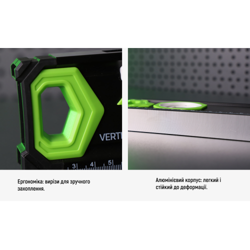 Корпус виготовлений з анодованого алюмінію, є вбудовані магніти, міліметрова шкала по всій довжині та 2 ергономічних вирізи для зручного хвату.