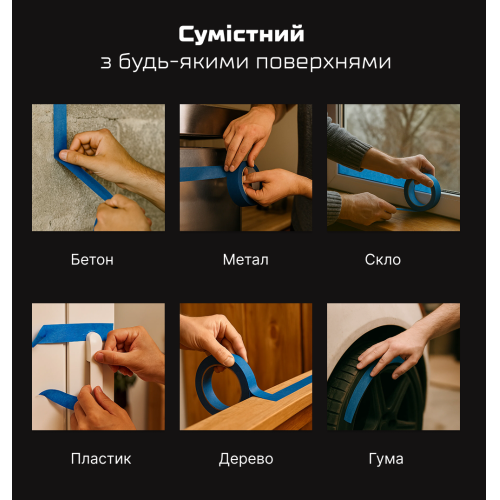 Завдяки надійній адгезії стрічка добре прилипає до бетону, металу, скла, пластику, дерева та гуми, не відклеюється під час роботи й знімається без залишків клею. Це робить її практичним вибором для будівельних, ремонтних і малярних робіт різної складності.