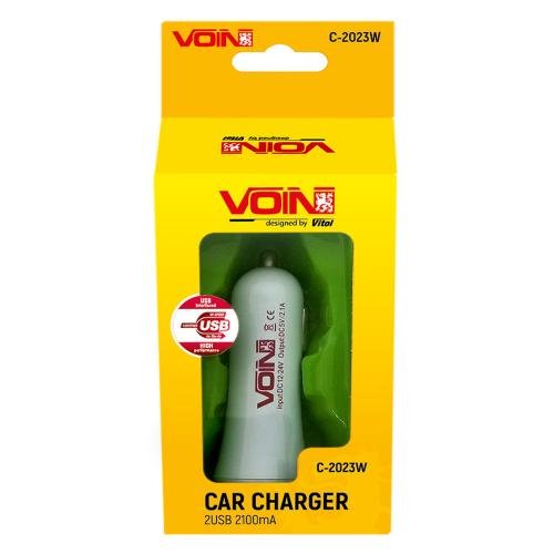Автомобільний зарядний пристрій 2×USB, 5 В 2,1 А, 12/24 В VOIN C-2023W призначений для живлення та заряджання портативних пристроїв від бортової мережі автомобіля. Підтримка напруги 12 і 24 В дозволяє використовувати пристрій як у легкових авто, так і у вантажному транспорті.
