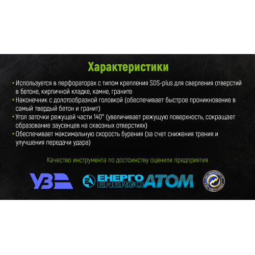 • Наконечник з долотоподібною головкою (забезпечує швидке проникнення в самий твердий бетон та граніт)