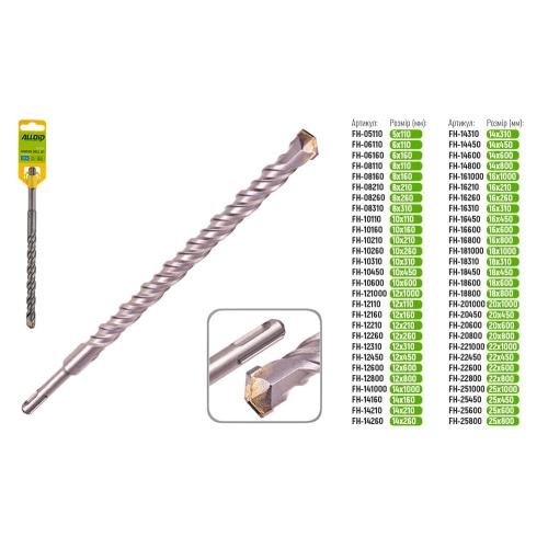 Бур для бетону Alloid 14×210мм використовується в перфораторах з типом кріплення SDS-plus для свердління отворів в бетоні, цегляній кладці, камені, граніті.