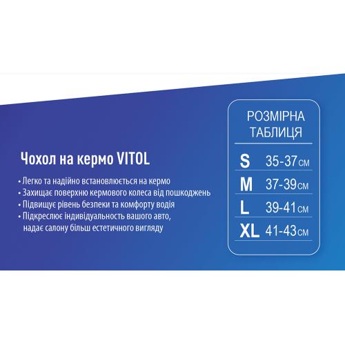 Еластичний чохол на руль бренду Vitol виготовлений з високоякісних матеріалів. Нековзний перфорований матеріал забезпечує вільну циркуляцію повітря, зберігаючи долоні сухими та створюючи комфорт водієві під час керування авто.