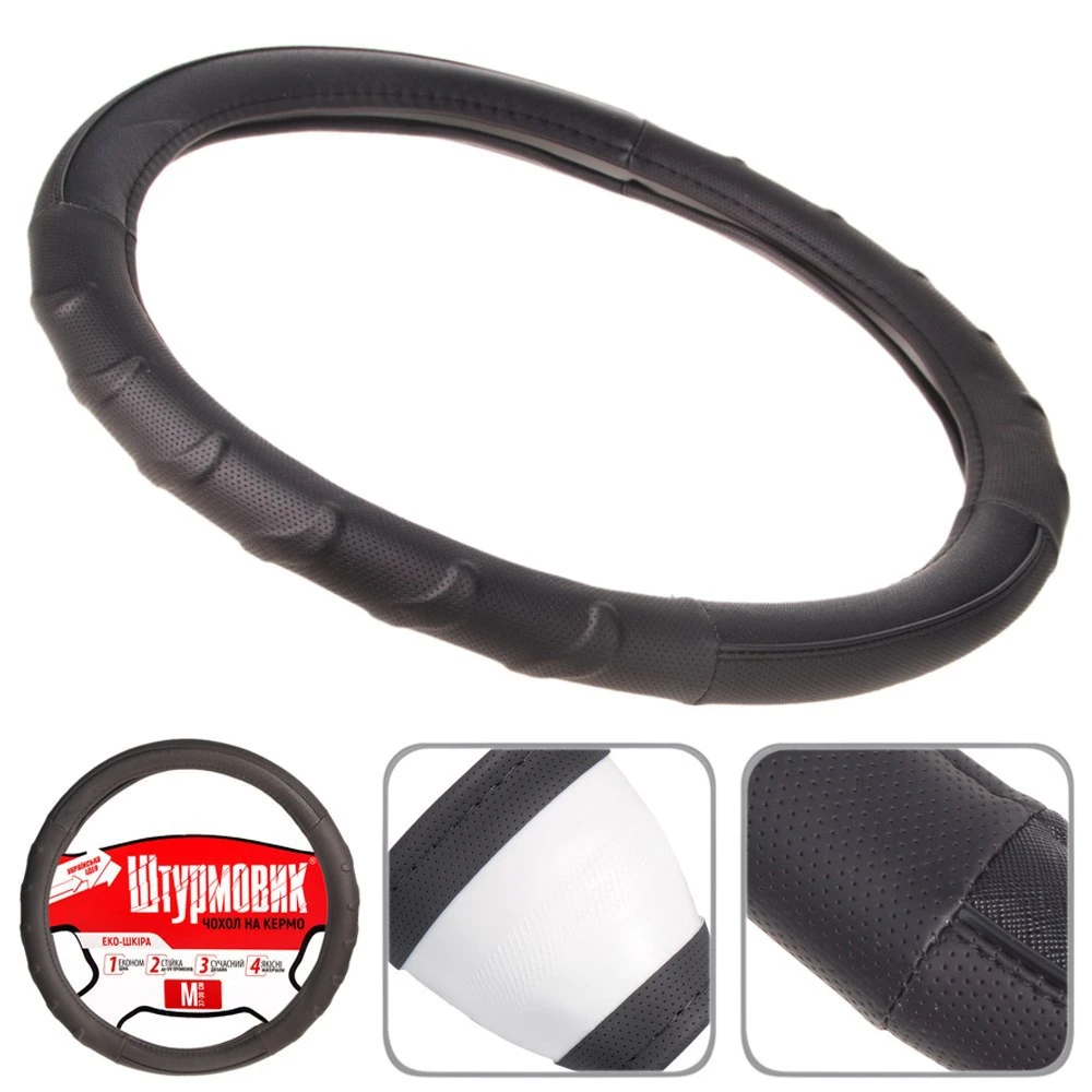 Чохол-оплетка Штурмовик Ш-203064/1 — натяжний чохол на кермо з еко-шкіри у монолітному чорному виконанні BK/BK від торгової марки ШТУРМОВИК (Vitol). Розмір M розрахований на кермові колеса діаметром 37–39 см і підходить для більшості легкових автомобілів. Чохол надягається без зав’язок і шнурів — щільна фіксація досягається еластичністю самого матеріалу.