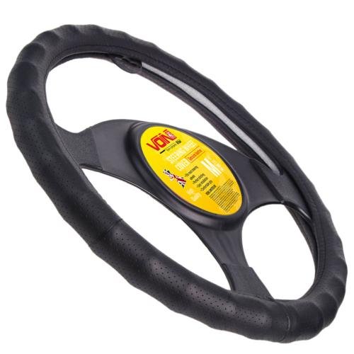 Чохол на руль виготовлений з нековзкого перфорованого матеріалу, який дозволяє вільно циркулювати повітрю і виходити волозі, зберігаючи долоні сухими і створюючи комфорт водієві під час руху за кермом.