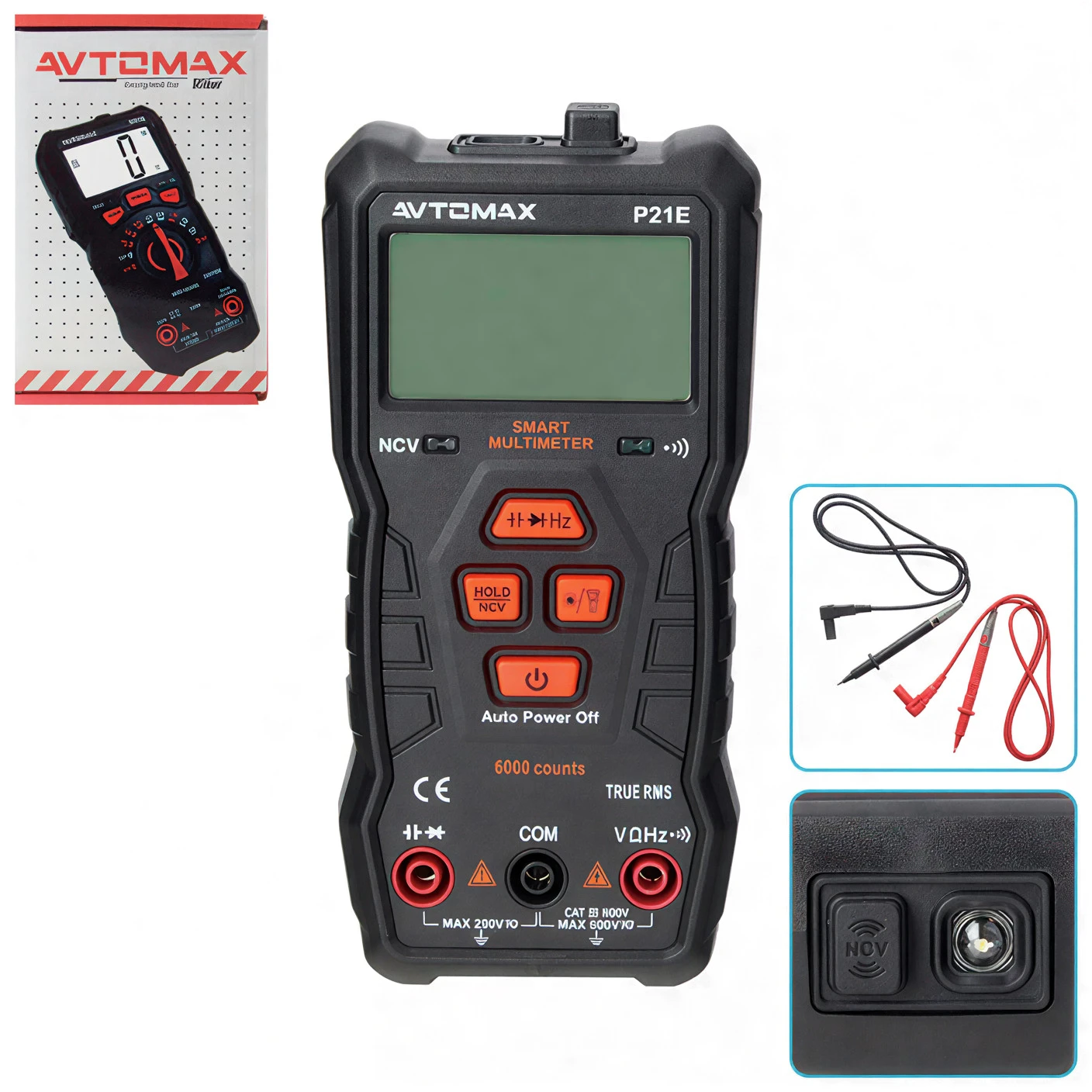 Цифровий мультиметр AVTOMAX P21E — універсальний вимірювальний прилад для точної діагностики електричних ланцюгів у побутових і професійних умовах. Модель поєднує широкий набір функцій, підсвітку дисплея та безконтактне виявлення напруги (NCV), що робить роботу безпечнішою та зручнішою. Компактний корпус і продумана ергономіка дозволяють використовувати прилад як у майстерні, так і на виїзді.