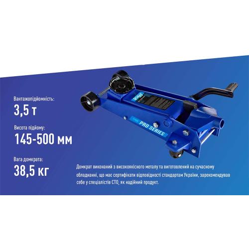 Домкрат гідравлічний підкатний Vitol DP-35038 призначений для інтенсивного використання під час шиномонтажних і ремонтних робіт. Вантажопідйомність 3,5 тонни дозволяє обслуговувати більшість легкових автомобілів, позашляховиків і легкого комерційного транспорту. Низький мінімальний підхват 145 мм дає змогу встановити домкрат під автомобіль навіть із невеликим дорожнім просвітом.