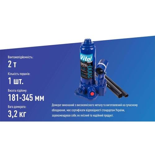 20 років на ринку України та десятки тисяч задоволених клієнтів підтверджують якість та надійність товарів ТМ Вітол. Придбавши телескопічний гідравлічний домкрат ДБ-02006К, ви будете готові до будь-яких викликів, які може кинути вам автомобільне життя.