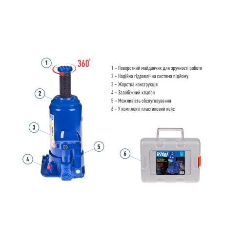Vitol Iron HAND – це обмежена лінійка домкратів, виділена в окремий бренд та об'єднана однією загальною рисою – вигідна ціна при збереженні високої якості. Придбавши телескопічний гідравлічний домкрат IH-185355D-K, ви будете готові до будь-яких викликів, які може кинути вам автомобільне життя.