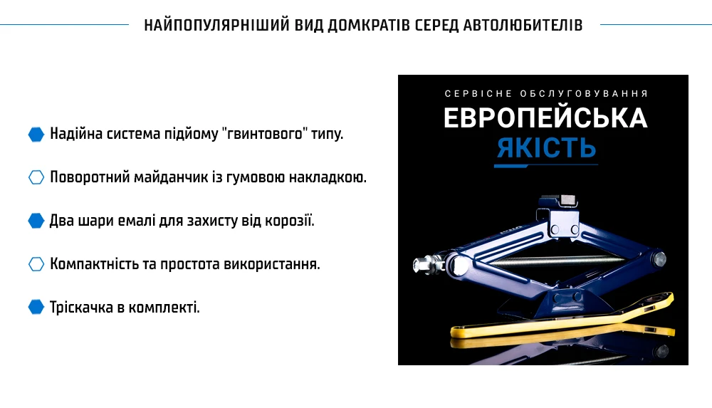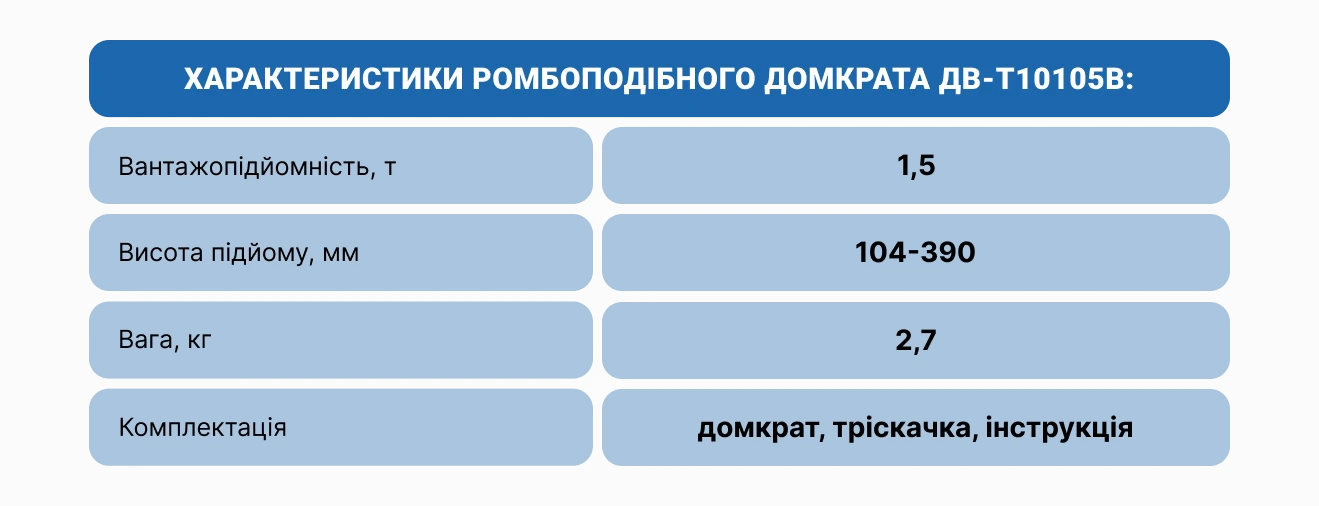 Будьте першим, хто залишив відгук на “Домкрат ромбоподібний VITOL DB-T10105B з тріщаткою 1,5 т, підйом 390 мм”