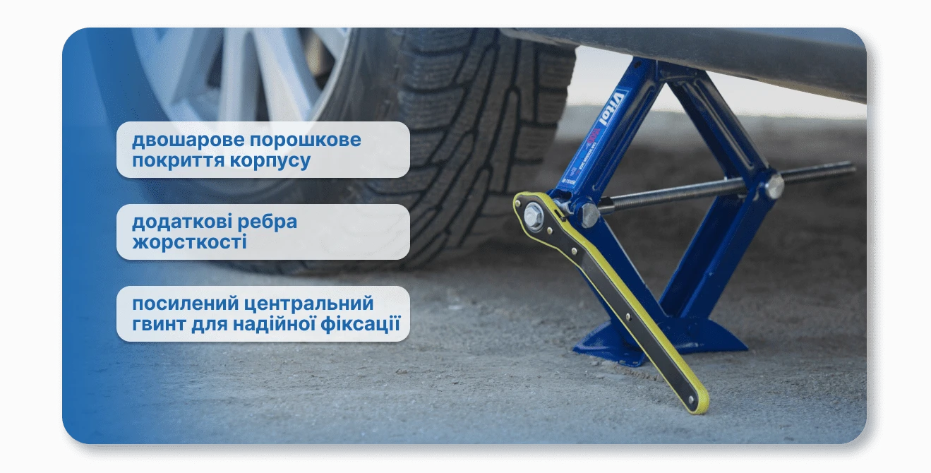 • Тріщатка: дозволяє підіймати автомобіль короткими зворотно-поступальними рухами важеля без необхідності робити повний оберт — суттєво знижує фізичне зусилля та прискорює процес.