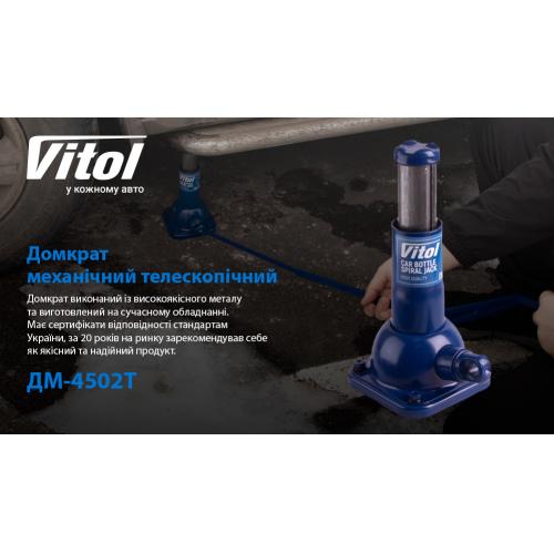 20 років на ринку України та десятки тисяч задоволених клієнтів підтверджують якість та надійність товарів ТМ Вітол. Придбавши телескопічний механічний домкрат ДМ-4502Т, ви будете готові до будь-яких викликів, які може кинути вам автомобільне життя.