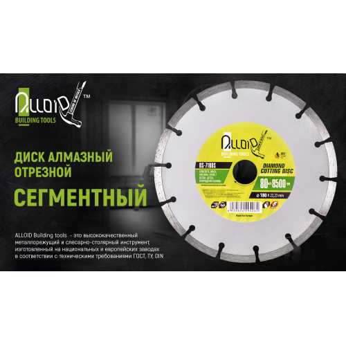 Диск Alloid DS-7180S з сегментами, діаметром 180 мм і посадковим отвором 22,23 мм. Диск має високі технічні характеристики і призначений для щоденного професійного використання у сфері будівництва та ремонтних робіт.