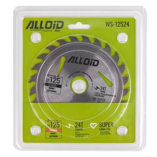 Пиляльний диск Alloid WS-12524 (125 мм, 24 зуба) призначений для швидкого та точного різу деревини, ДСП, фанери та МДФ. Твердосплавні напайки забезпечують довгий термін служби, чисту лінію різу без сколів і максимальну ефективність навіть при інтенсивному використанні.