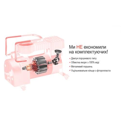 Під металевим корпусом прихований електродвигун поршневого типу з продуктивністю 35л / хв і потужністю 150Вт, що споживає 12А постійного 12В струму від роз'єму прикурювача в автомобілі. Якісні комплектуючі дозволяють за 2-3 хвилини накачати колесо вашого автомобіля і зберігають продуктивність навіть при високому стартовому тиску колеса, що накачується.