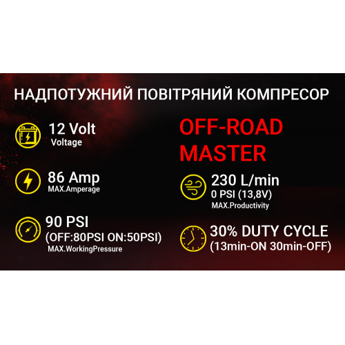 Модель забезпечує високу продуктивність 230 л/хв при максимальному тиску 90 PSI. Компресор працює від бортової мережі 12 В та розрахований на серйозні навантаження з максимальним струмом споживання 86 A.
