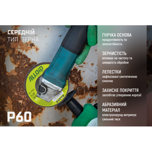 • Зерно P60 — оптимальний баланс між зніманням матеріалу та чистотою обробки