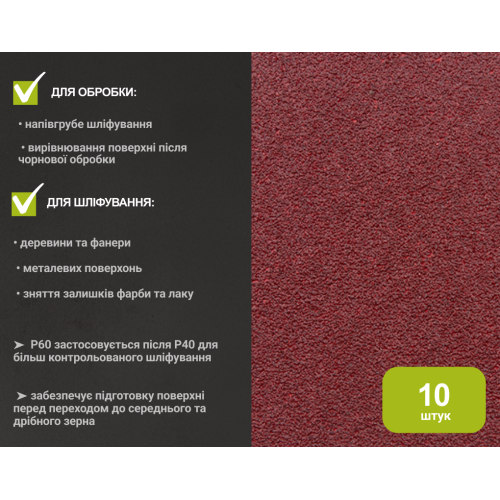 Кріплення на липучці (hook & loop) забезпечує швидку заміну без додаткових інструментів, а абразивна поверхня дозволяє досягти рівномірного результату.
