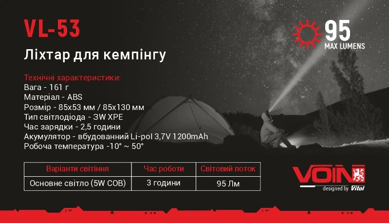 Ліхтар кемпінговий VOIN VL-53 призначений для освітлення на природі, під час кемпінгу, риболовлі, походів або аварійних ситуацій. Він також підходить для використання вдома при відключеннях електроенергії. Завдяки можливості підвішування його зручно використовувати в наметах, на гілках або в гаражі.
