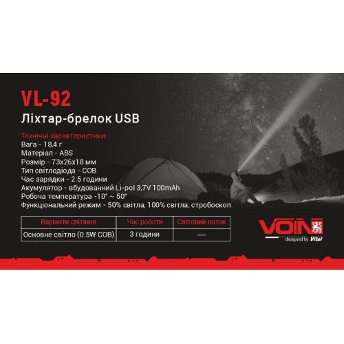 Портативний акумуляторний ліхтар-брелок VOIN VL-92 стане в нагоді в побуті, в дорозі, в походах або кемпінгах. Розмір ліхтаря-брелок дозволяє його легко розмістити в кишені, в сумці або в автомобілі. Наявність кільця дозволяє підвісити ліхтарик на зв'язку.