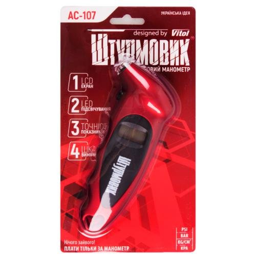 Манометр Штурмовик АС-107 дозволяє проводити вимірювання в трьох системах psi-bar-кg. Якщо тиск в шинах нижче ніж треба обов'язково підкачайте його до необхідного, наприклад, компресором автомобільним Штурмовик АС-30.
