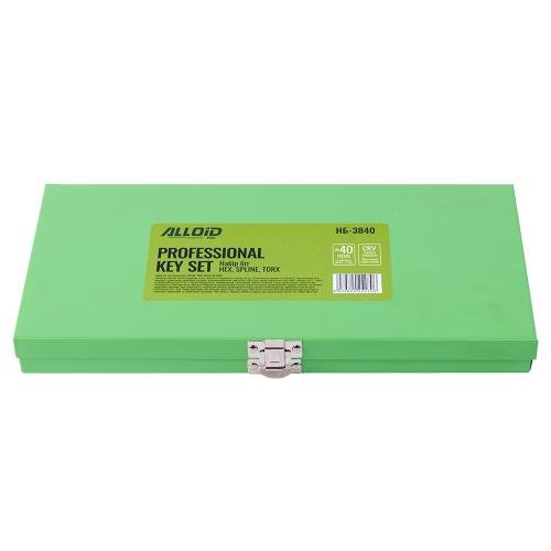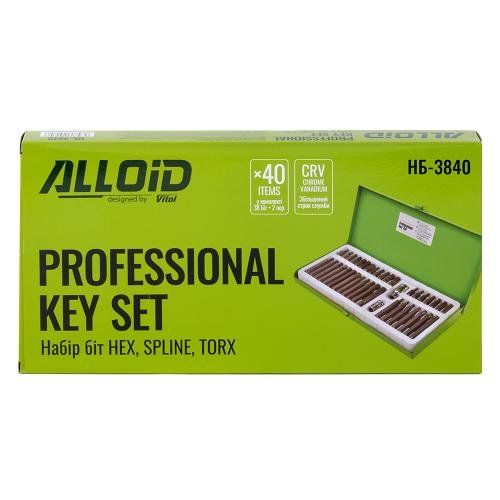 Набір біт Alloid НБ-3840 постачається у фірмовому металевому кейсі з надійною застібкою. Кожна бита має своє місце у пластиковій підкладці з фігурними поглибленнями — це виключає втрату окремих елементів і запобігає взаємному ушкодженню насадок під час зберігання чи транспортування. Компактний кейс легко розміщується у ящику інструментального візка або в сумці виїзного майстра.