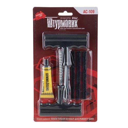 Набір для ремонту шин Штурмовик AC-109 — компактний комплект для оперативного ремонту проколів безкамерних шин у зоні протектора. Він розроблений для швидкого усунення пошкоджень у дорозі та дозволяє відновити герметичність колеса без демонтажу шини.