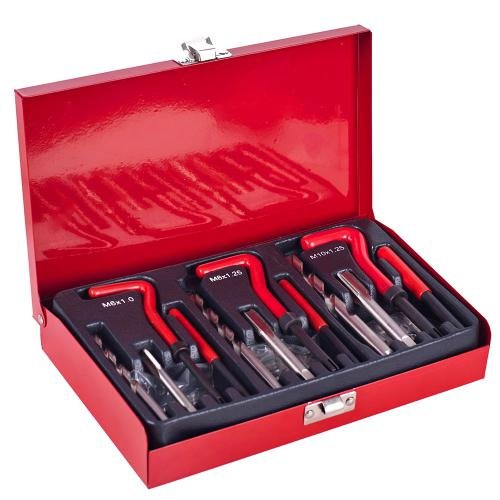 Комплект розрахований на роботу з найпоширенішими розмірами різьби M6, M8 та M10. Процес відновлення передбачає розсвердлювання пошкодженого отвору, нарізування нової різьби та встановлення спіральної вставки, яка формує міцне та зносостійке різьбове з’єднання.