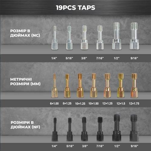 Інструменти з комплекту забезпечують точне формування нової різьби та коректне встановлення різьбових вставок. Загартована сталь підвищує зносостійкість елементів і дозволяє використовувати набір у режимі регулярних навантажень без втрати точності.