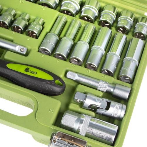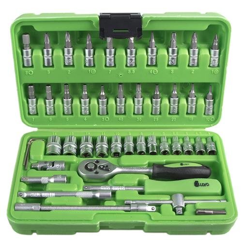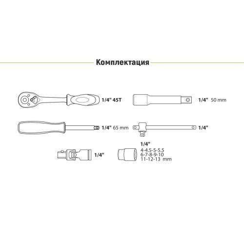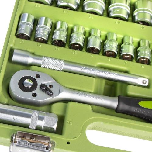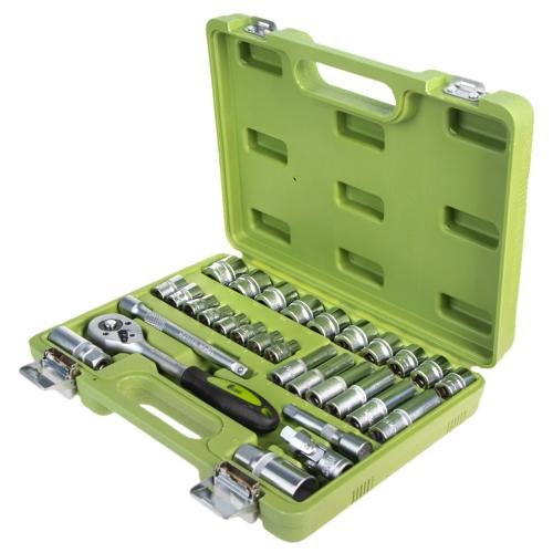 У наборі міститься 30 одиниць інструментів, які дозволяють виконувати більшість завдань в автомайстерні. У комплекті є все необхідне для ремонту — тріскачка на квадрат 3/8” та великій вибір головок різних типів.
