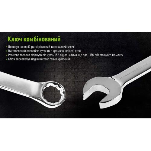 Інструмент має як ріжкову, так і накидну частину, що підвищує його функціональність. Дванадцятигранний профіль накидних головок забезпечує роботу з 6 та 12-гранними кріпильними елементами. Механізм хропіння кожної тріскачки оснащений 72 зубцями з кутом до наступного клацання в 5 градусів, що значно розширює можливості їх застосування – тріскачки відмінно підійдуть для вузьких і важкодоступних місць.