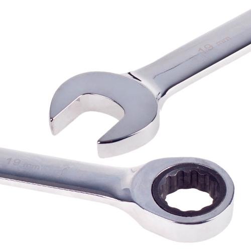Підвищену функціональність комбінованому ключу надає тріскачка (кут до клацання 5°) та шарнірне з'єднання (кут обертання 180°) у накидній частині. Дванадцятигранний профіль головок дозволяє працювати як з 6-гранними, так і з 12-гранними кріпильними елементами.