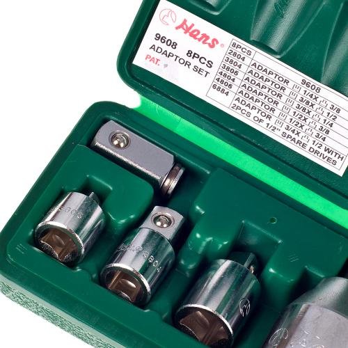Набір перехідників HANS 9608 — це універсальний комплект з 8 адаптерів, які дозволяють поєднувати оснастку з різними типами квадратів: 1/4″, 3/8″, 1/2″, 3/4″ та 1″. Це дає змогу використовувати один набір для великої кількості завдань — від обслуговування автомобілів до складальних і монтажних робіт.