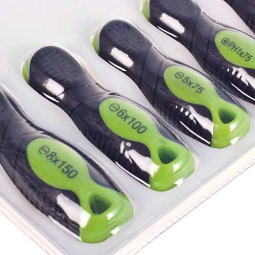 Стрижні виконані з легованої хром-ванадієвої сталі (CrV), яка поєднує твердість і пружність: наконечники витримують значні крутні навантаження без деформації та довго зберігають форму при регулярному використанні. Це принципово важливо при роботі із закислими чи туго затягнутими кріпленнями, де м’якший метал швидко втрачає профіль. Двокомпонентні ручки мають ергономічний профіль, що забезпечує надійне зчеплення з долонею і рівномірний розподіл зусилля. Ключова перевага матеріалу ручок — стійкість до розчинників та нафтопродуктів, що особливо актуально для СТО, гаражного ремонту та роботи в умовах хімічно агресивного середовища.