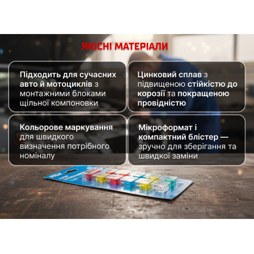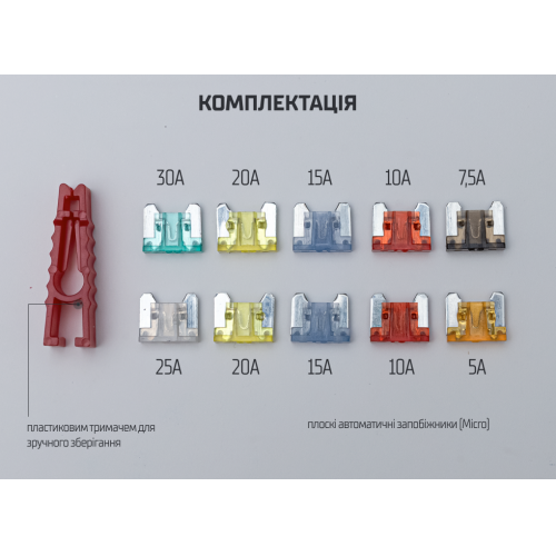 Діапазон від 5A до 30A дозволяє перекрити більшість стандартних електроланцюгів у легкових авто та мотоциклах. Кольорове маркування кожного номіналу спрощує підбір потрібного елемента та зменшує ризик встановлення запобіжника з неправильним значенням струму. Це економить час під час обслуговування та підвищує безпеку експлуатації.