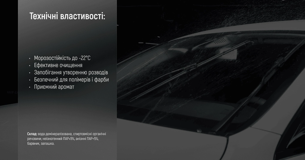 - Робота в мороз. Зберігає текучість до -22°C, що допомагає системі омивання працювати без збоїв у холодну погоду.