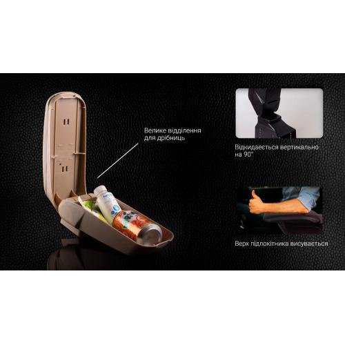 У моделі передбачений великий відсік для зберігання документів або необхідних авто-дрібниць. При необхідності верхню кришку підлокітника можна просунути вперед для більш комфортного положення. У внутрішньому відсіку присутня захисна накладка, що дозволяє зберігати в ньому будь-які металеві предмети і не переживати, що будуть утворюватися подряпини у внутрішньому просторі підлокітника.