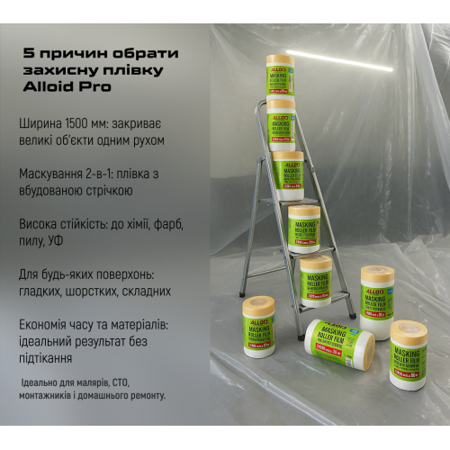 Захисна плівка Alloid Pro шириною 1,5 метра — професійне рішення для маскування великих поверхонь. Поєднує в собі прозору поліетиленову плівку та малярну стрічку, що забезпечує точне, зручне та чисте нанесення. Надійно захищає об’єкти під час фарбування, свердління, оздоблення чи ремонту.