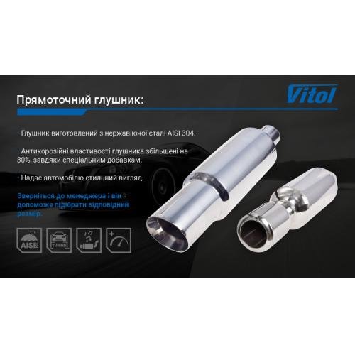 Прямоточний глушник від торгової марки Vitol виконаний з нержавіючої сталі і прекрасно протистоїть корозії навіть при попаданні на нього антігололедних реагентів використовуваних в зимову пору року.