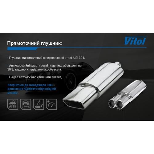 Прямоточний глушник від торгової марки Vitol виконаний з нержавіючої сталі і прекрасно протистоїть корозії навіть при попаданні на нього антігололедних реагентів використовуваних в зимову пору року.