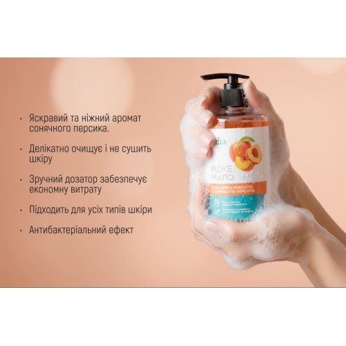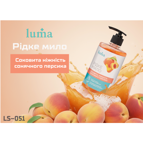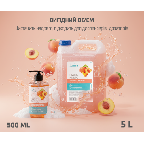 Рідке мило Luma «Персик» 500 мл дарує приємний фруктовий аромат і дбайливо очищає шкіру, залишаючи її м’якою та зволоженою. Підходить для всієї родини та щоденного використання.