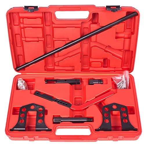 Набір застосовується під час заміни клапанів, маслознімних ковпачків або виконання інших робіт, пов’язаних із розбиранням клапанного механізму головки блоку циліндрів. Інструмент дозволяє безпечно стискати клапанні пружини та фіксувати їх у робочому положенні без пошкодження деталей.
