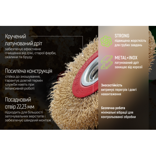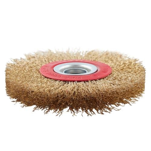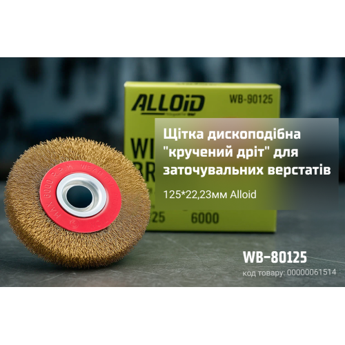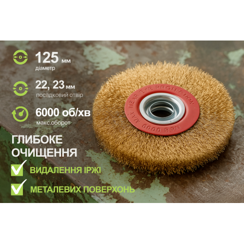 Дискова щітка Alloid 125 мм із крученого латунованого дроту — надійний інструмент для видалення іржі, окалини, старої фарби та бруду. Підходить для більшості заточувальних верстатів завдяки стандартному отвору 22,23 мм. Стійкий дріт гарантує довгий термін служби навіть при інтенсивному використанні.