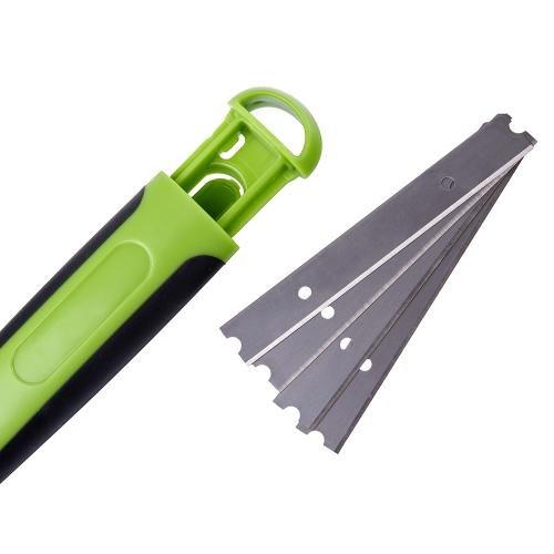 Леза SK7 ефективно зрізають залишки матеріалів без надмірного натиску, що допомагає зберігати цілісність поверхні. Прогумована ручка мінімізує ковзання навіть у вологих умовах або під час тривалої роботи. Вбудований відсік для запасних лез дозволяє зберігати їх у корпусі інструмента, що зручно під час транспортування та щоденного використання.