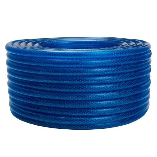 Стінка шланга складається з трьох функціональних шарів: гладкий внутрішній ПВХ-шар забезпечує вільний прохід води без відкладень і запаху, середній армувальний шар утримує форму під тиском і запобігає здуванню, зовнішній шар захищає від стирання об ґрунт, бордюри та інші тверді поверхні. Синій колір оболонки дозволяє легко розрізнити шланг на ділянці та швидко знайти місце пошкодження чи перегину.