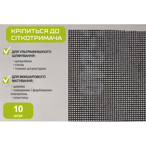 Сітка виготовлена з міцного волокна з рівномірним нанесенням абразиву. Сітчаста структура дозволяє пилу проходити крізь поверхню, не забиваючи абразив і подовжуючи його термін служби. Листи гнучкі, не рвуться, легко кріпляться до тёрки й забезпечують рівномірну обробку.