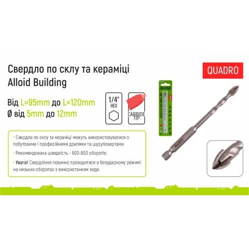 Свердло торгової марки Alloid Building призначене для швидкого і ефективного свердління отворів у керамічній плитці або незагартованої склі. Наконечник свердла виконаний зі спеціального сплаву титану з вольфрамом, заточка проведена на високоточному сучасному німецькому обладнанні. Завдяки складу та заточуванню наконечник свердла витримує тривалу роботу і має збільшений робочий ресурс. Наконечник виконан у формі хреста і має 4 ріжучі кромки.