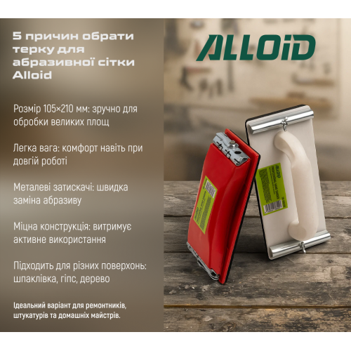 Пластикова тёрка Alloid 105×210 мм — це зручний ручний інструмент для шліфування стін, гіпсокартону, шпаклівки та деревини. Оснащена міцними пружинними зажимами, що надійно фіксують абразивну сітку чи наждачний папір. Виготовлена з ударостійкого пластику, тёрка має малу вагу, що знижує навантаження на руки під час роботи.