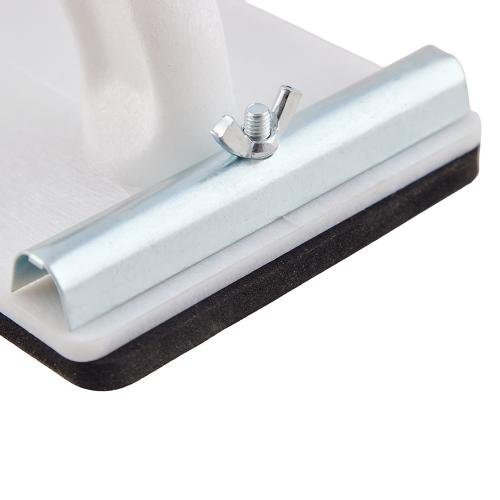 Цілісне лиття без слабких зон робить корпус надзвичайно міцним — тёрка не деформується під навантаженням. Надійні прижими з гвинтовими фіксаторами дозволяють швидко змінювати сітку, забезпечуючи зручність на об'єкті. Велика робоча площа скорочує час обробки поверхонь, а ручка ергономічної форми гарантує комфорт у роботі.