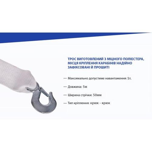 Трос буксирувальний 5т стрічка 50мм х 5,0м білий/2 гаки/в пакеті